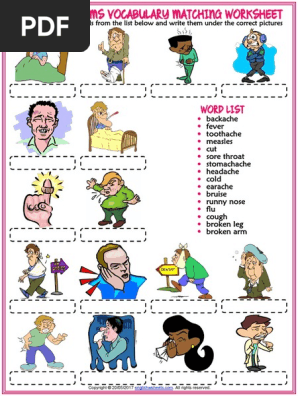 Health Problems Illnesses Sickness Ailments Injuries Matching Exercise Vocabulary Worksheet Common Cold Influenza from imgv2-1-f.scribdassets.com We'll also show you how some words we use to talk about illness are different in british and american english. This time it's a complete english vocabulary list about the most common types of pain and illnesses. # not suitable for all phones. List of esl vocabulary about health problems with the meaning of each one. English vocabulary for esl learners. English vocabulary exercises elementary and intermediate level: Health, illness, sickness, injuries, aches and pains. Spa fitness gym workout massage vocabulary and dialogs 18.
